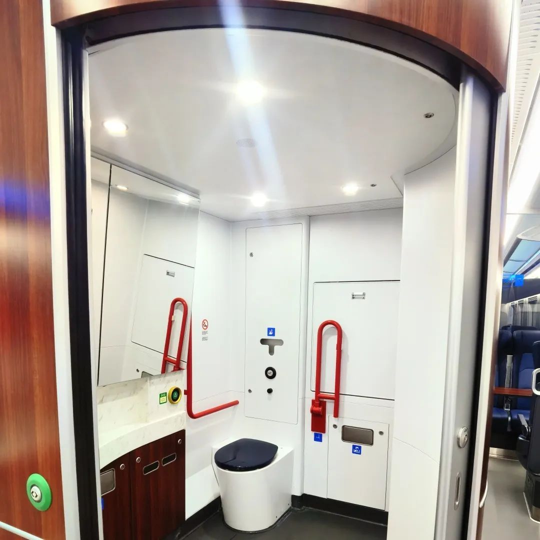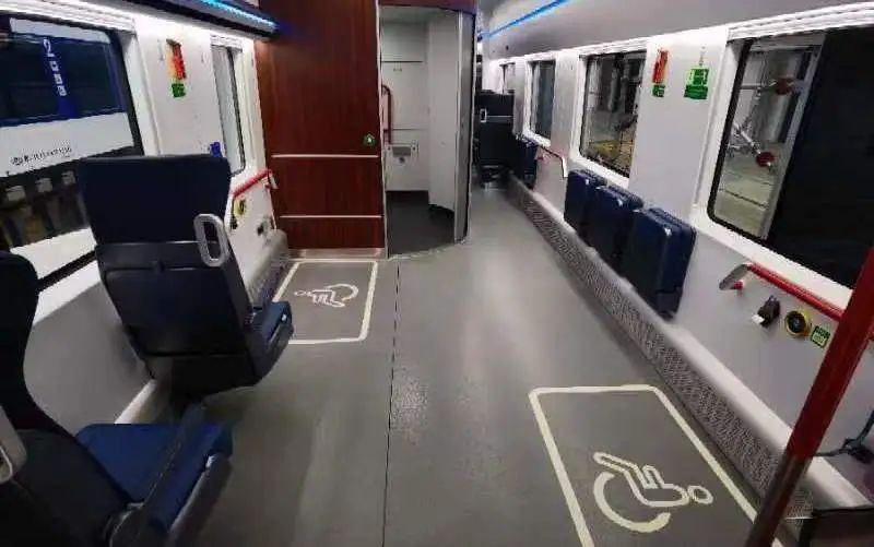 匈塞铁路高速动车组为动力分散型电力动车组,最高运行时速200公里,全长约103米,采用4辆编组,设一等座车1辆、二等座车3辆,总定员250人,动车组配置动力电池,在无电区域仍具备自主续航能力。车体外观呈流线型,采用塞尔维亚国旗色“红、蓝、白”三色涂装,车头侧面黑色区域造型提取了塞尔维亚国徽双头鹰元素,蓝色渐变的色带宛如雄鹰展开的羽翼;红蓝两条色带分别象征着“新丝绸之路”和“21世纪海上丝绸之路”,体现了中塞两国高质量共建“一带一路”,携手实现共同发展繁荣的美好愿景;内装色彩与车外造型相互呼应,氛围灯、智能座位显示等细节充分体现动车组现代化、智能化、人性化的设计理念。动车组车厢内设置轮椅、自行车、大件行李存放区,配备咖啡机、售卖机等服务设施,努力满足旅客多样化需求。
